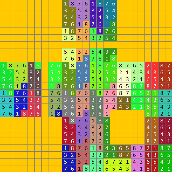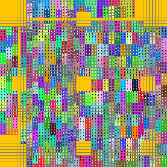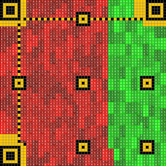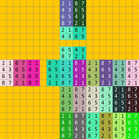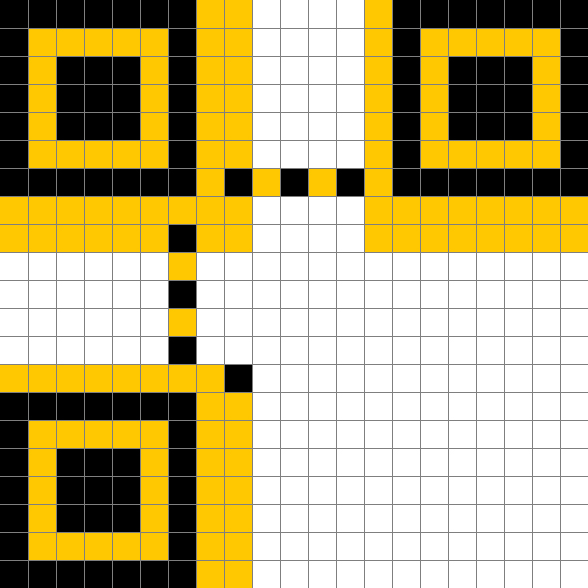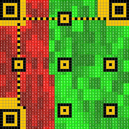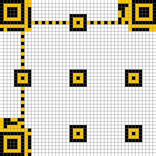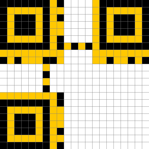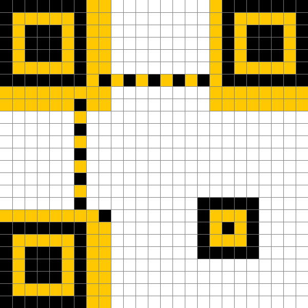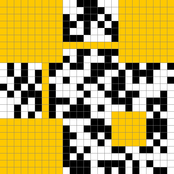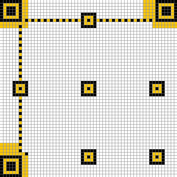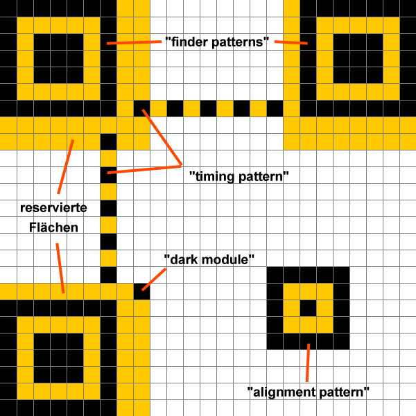Zunächst werden die fixen Bestandteile des Codes in die Matrix eingezeichnet. Die orangen Bereiche sind reserviert und dürfen für die anschliessende Platzierung der Datenmodule nicht verwendet werden.Grundelemente