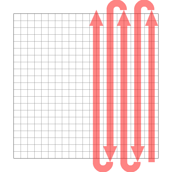 Die einzelnen Datenmodule werden von unten rechts beginnend in die Matrix eingefüllt, wobei die reservierten Flächen einfach übersprungen bzw. umflossen werden. Die einzige Ausnahme bildet das vertikale "timing pattern". Wird dieses während dem Einfüllen erreicht, so wird die Eintragung danach erst zweimal nach links und dann wieder normal fortgeführt.Einfüllprinzip